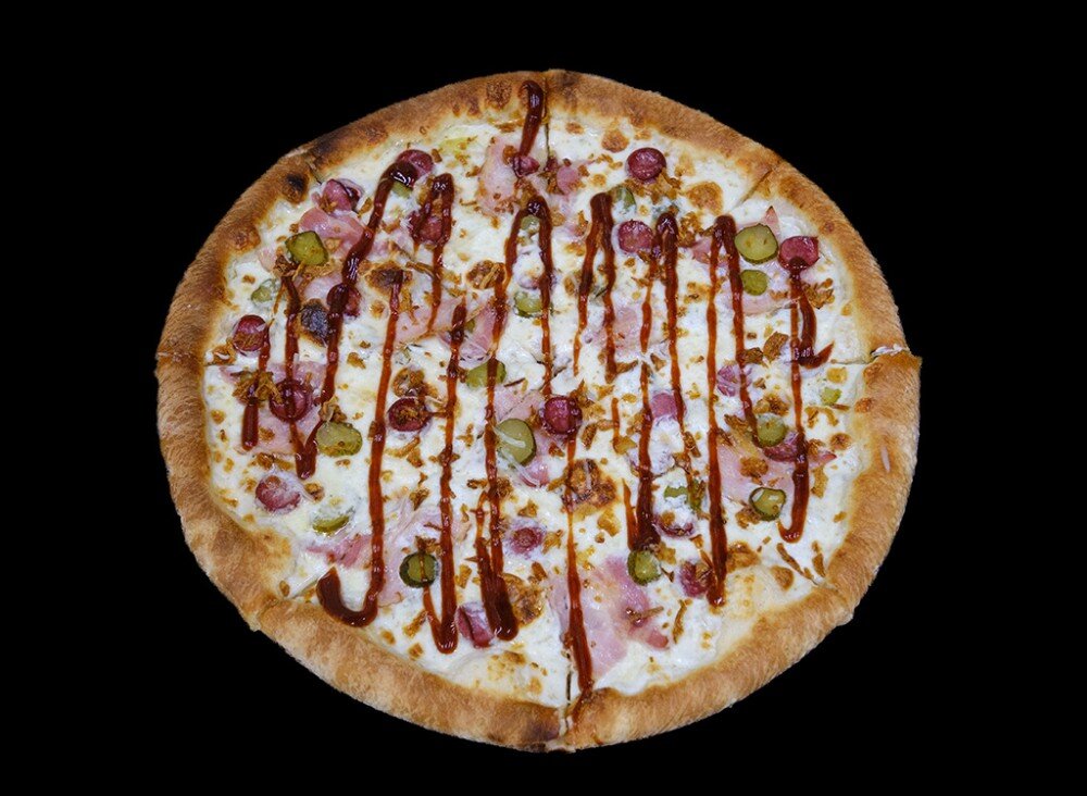Пицца на основе белого соуса, бекон, охотничьи колбаски, маринованные огурчики, сыр моцарелла, украшается хрустящим жаренным луком и поливается соусом BBQ